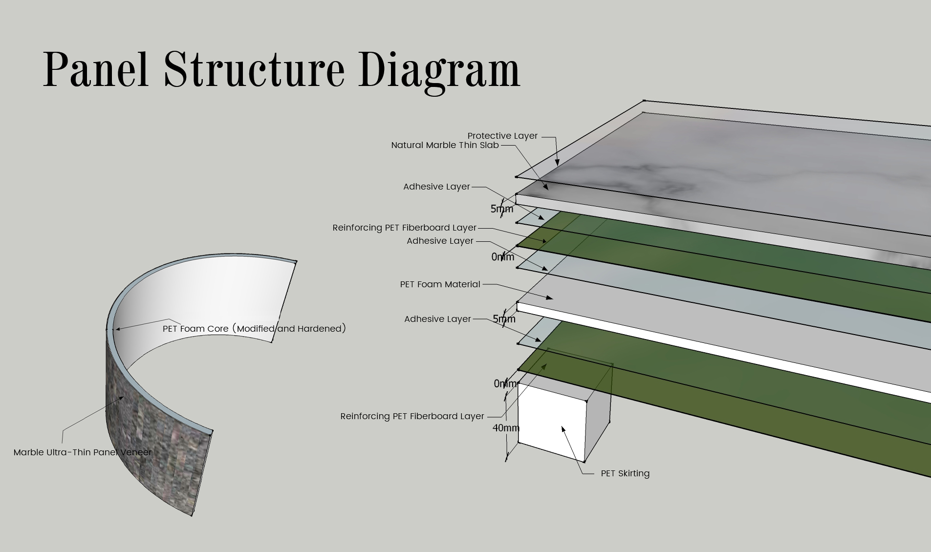 Lightweight & Thin Profile: Features 3-5mm natural stone laminated onto waterproof/fireproof substrates with customizable thickness. Weighs under 20kg/m² – only 1/20 to 1/2 the weight of traditional stone.